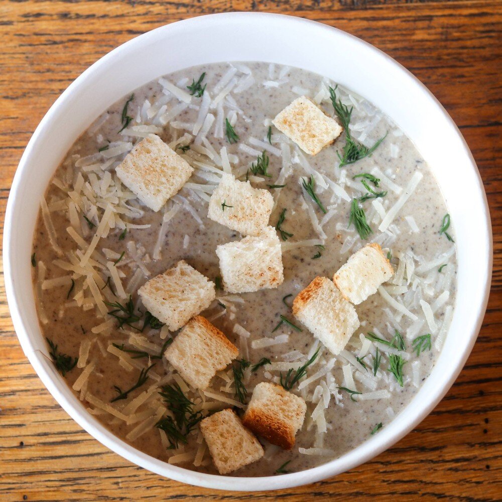 Нежный крем суп ,приготовленный из шампиньонов с добавлением сливок и сыра пармезан. Подается с французскими гренками собственного приготовления.