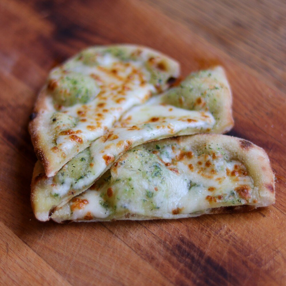Тесто, масло чесночное, сыр моцарелла.