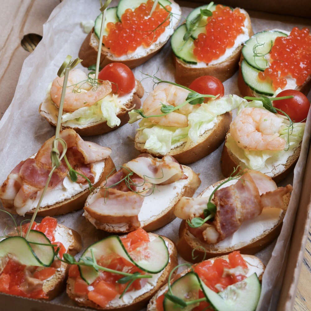 Брускетта с красной икрой (имитация) и огурцом на творожной сыре 3шт,брускетта с форелью на творожной сыре 3шт,брускетта на творожной сыре с королевской креветкой и черри 3шт,брускетта с отправленным беконом 3шт