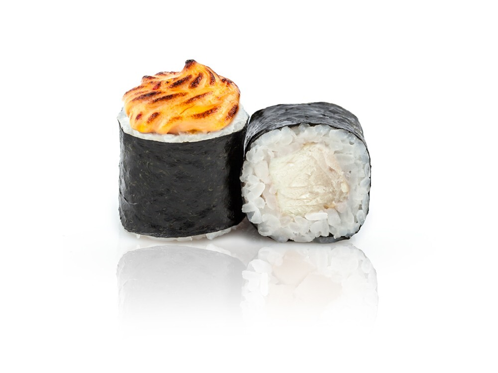 Курица, фирменная сырная шапка, соус «Унаги», кунжут, рис, нори (8 шт)