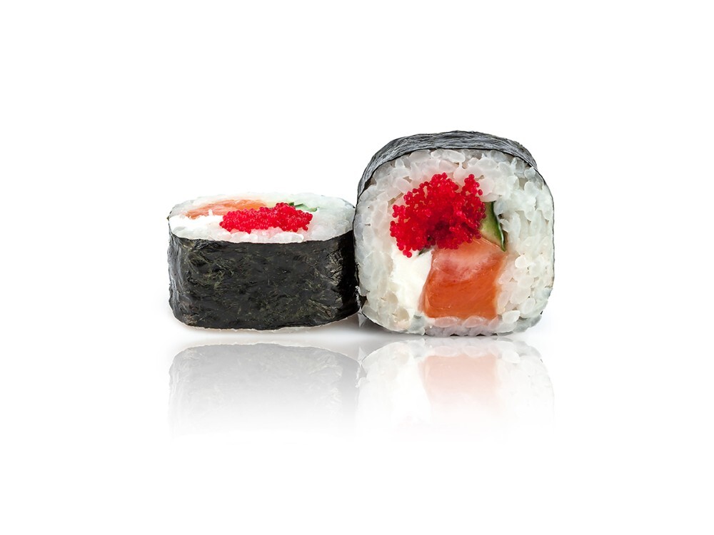 Лосось, огурец, сыр «Филадельфия», икра масаго, рис, нори (8 шт)