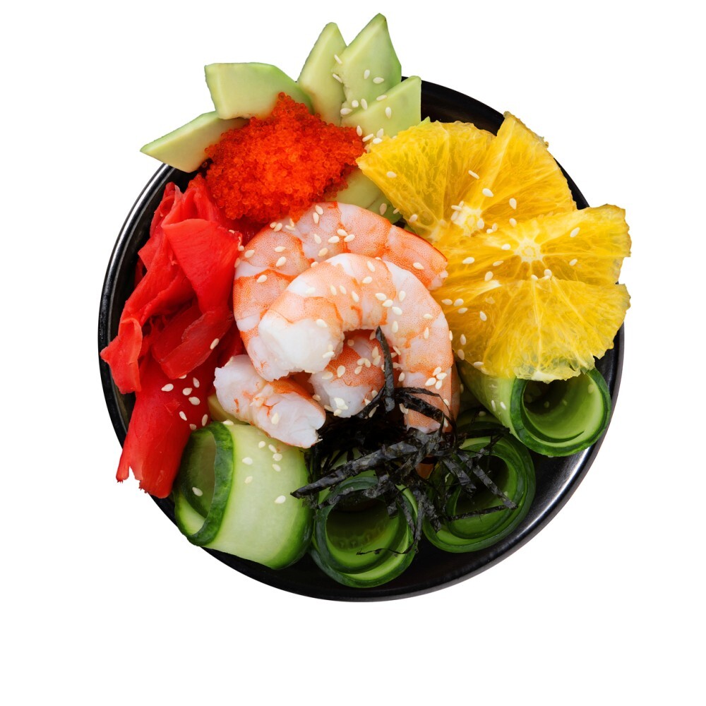 Креветка королевская, икра Масаго, авокадо, апельсин, огурец, имбирь, кунжут, нори, рис. Соус на выбор: кунжутный, унаги, терияки, соевый.
