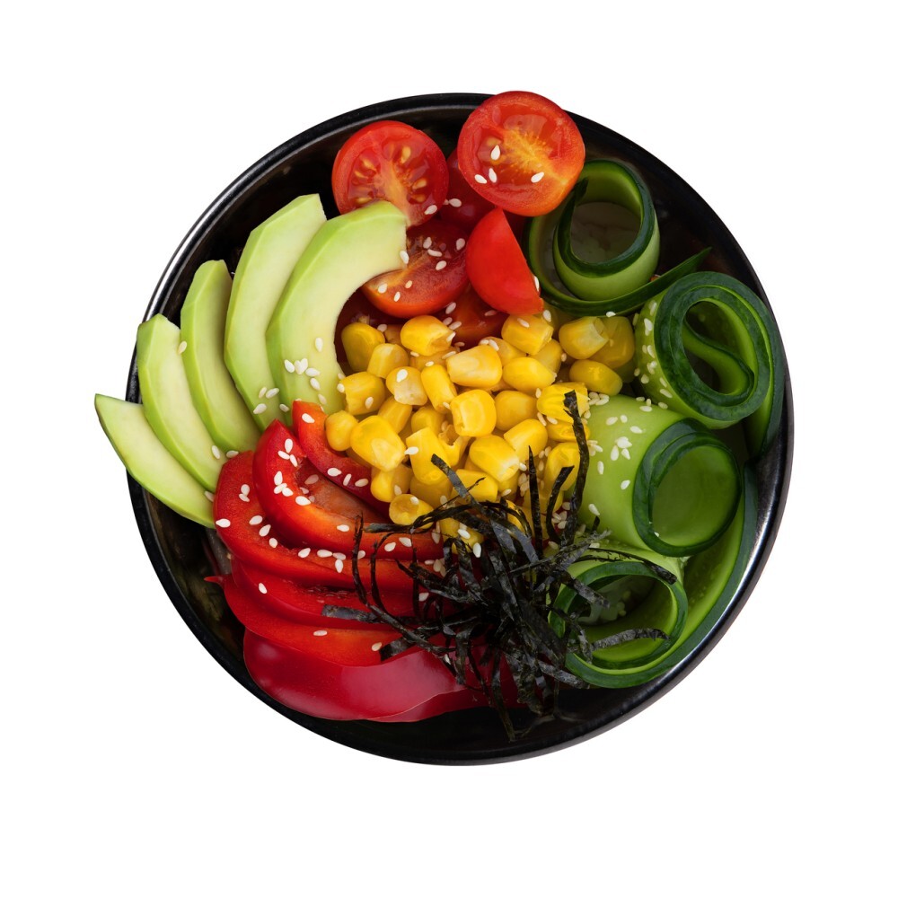 Авокадо, черри, огурец, кукуруза, перец, нори, кунжут, рис., Соус на выбор: кунжутный, унаги, терияки, соевый.