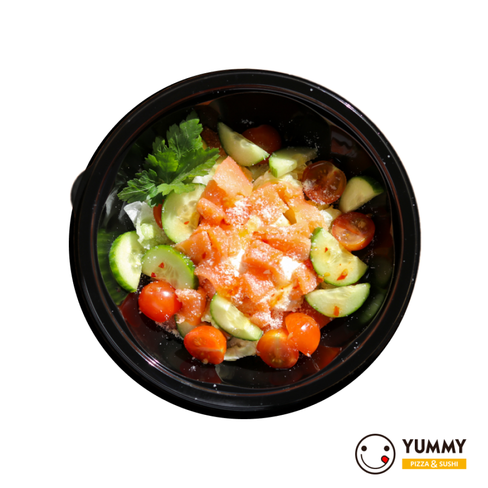 Салат айсберг, фирменный соус, свежие огурцы,черри, форель с/c, сыр пармезан, соус сладкий чили.