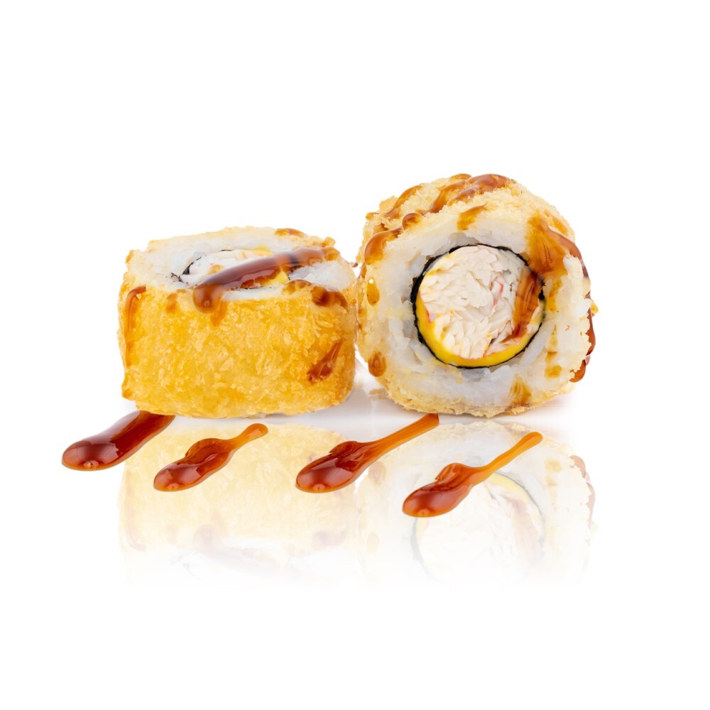 Краб, сыр Чеддер (плавленный), кляр, сухари Панко, соус Терияки, рис, нори (8 шт))