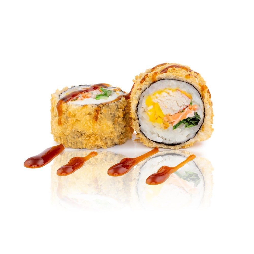 Краб, лосось, сыр Чеддер (плавленный), салат, кляр, сухари Панко, соус Терияки, рис, нори (8 шт)