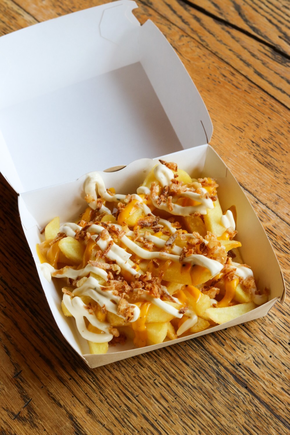 Картофель фри поливается горчичным и сливочно-чесночным соусом, посыпается луковыми хлопьями.