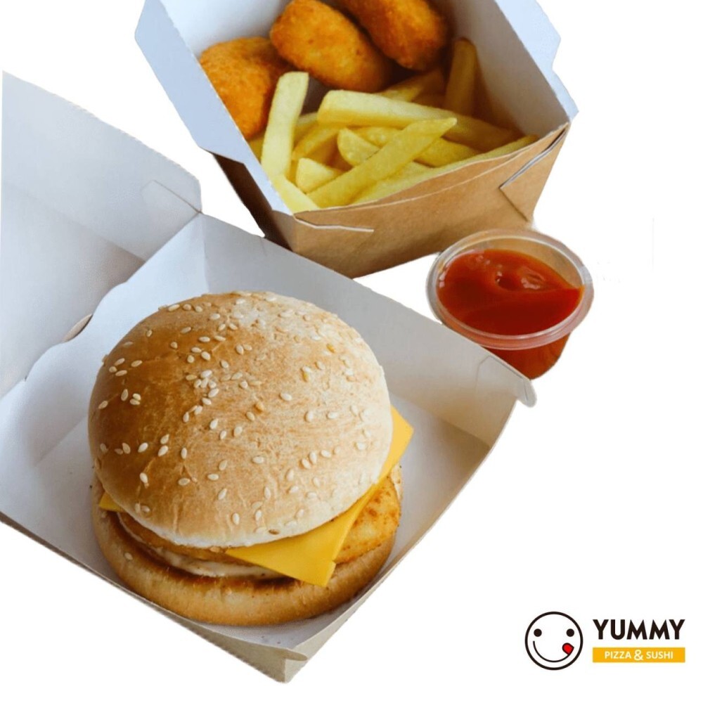 Бургер с куриной котлеткой ,ломтиком сыра Чеддер с добавлением соленого огурца и свежего томата. /230гр.Наггетсы / 3шт,картофель фри S / 90гр ,соус "Кетчуп" / 40гр