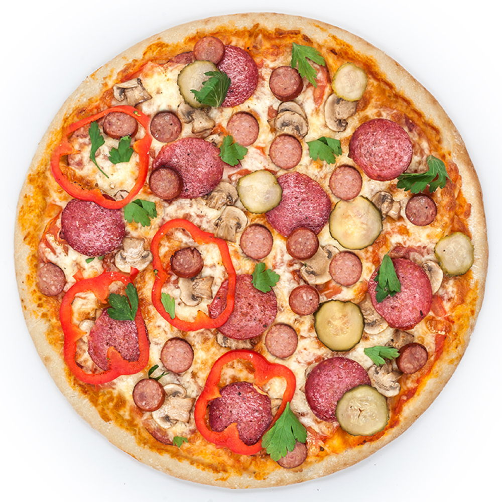 Салями, сервелат, колбаски «Охотничьи», томат, шампиньоны, перец болгарский, соленый огурец, петрушка, сыр «Моцарелла», тесто, томатная паста