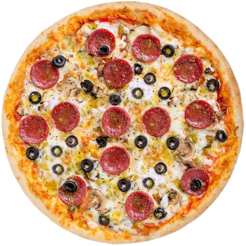 Пепперони, шампиньоны, томат, маслины, соус Песто, базилик, сыр «Моцарелла», тесто, томатная паста
