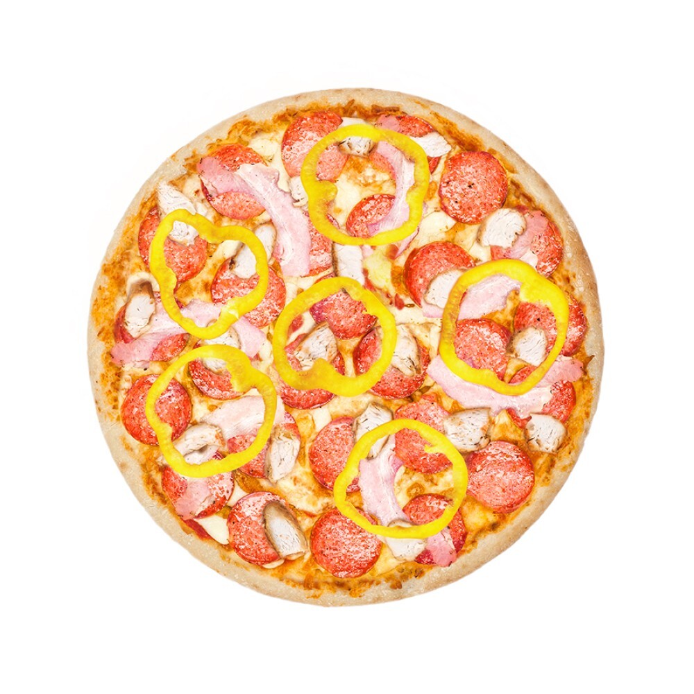 Карбонат, бекон, пепперони, курочка, перец болгарский, сыр Моцарелла, тесто