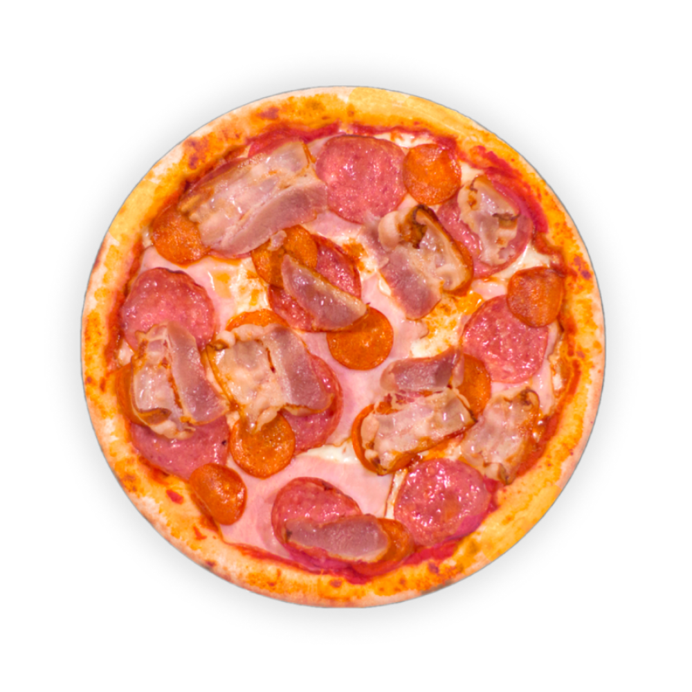 Соус томатный, ветчина, пепперони, салями, колбаски охотничьи, бекон, сыр