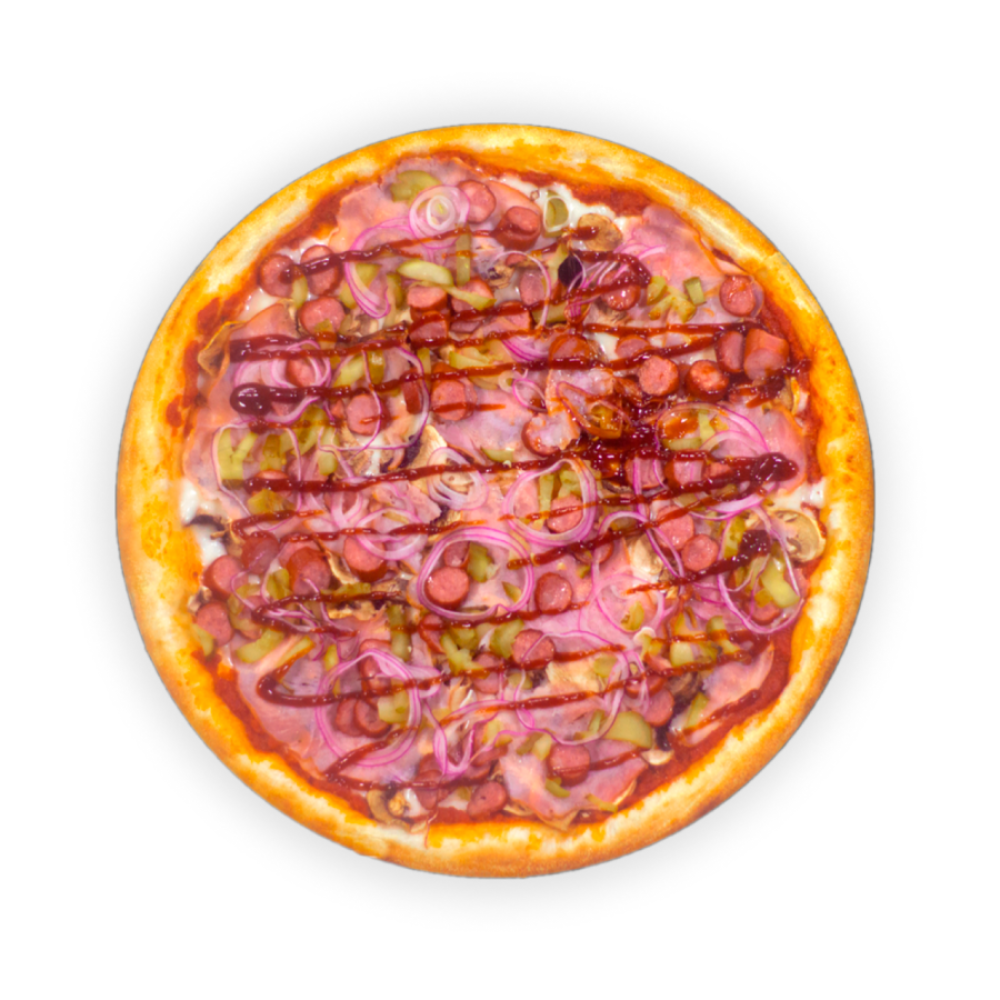 Соус томатный, ветчина, сыр, грибы, колбаски охотничьи, корнишон, лук, соус BBQ