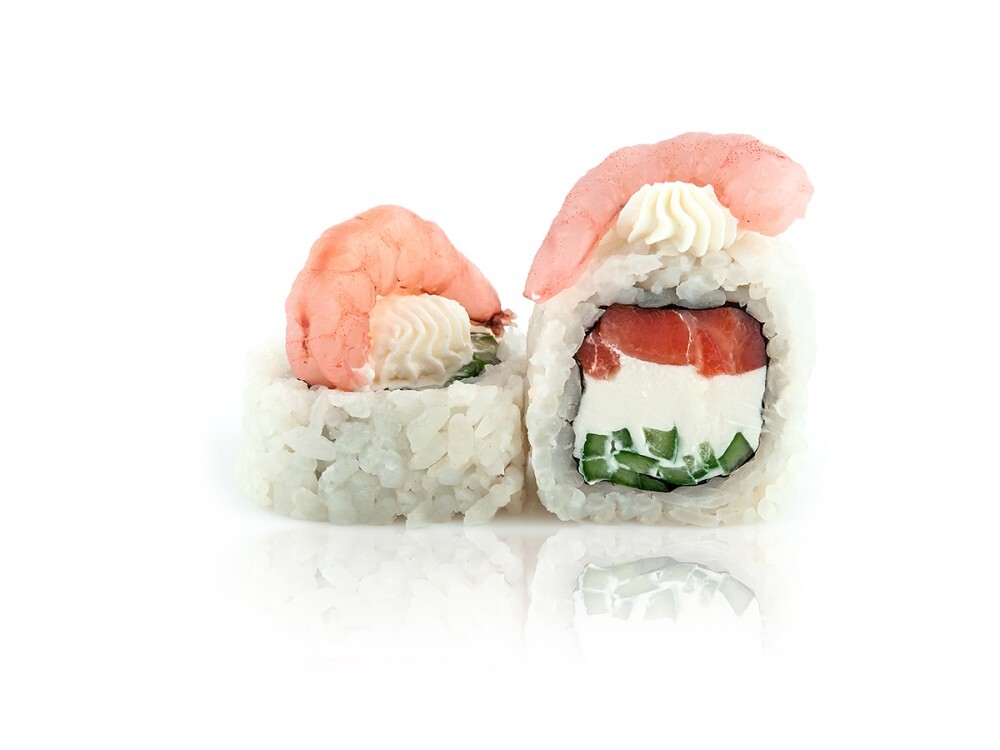 Лосось, креветка, сыр «Филадельфия», огурец, рис, нори (8 шт)