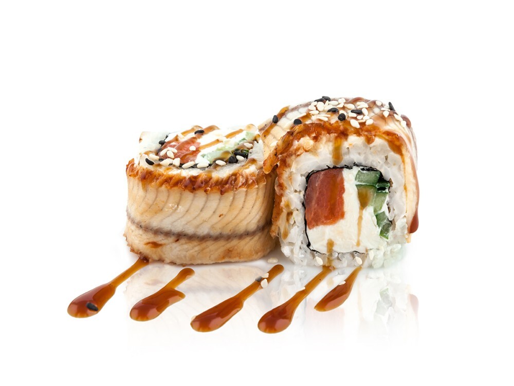 Угорь, лосось, сыр «Филадельфия», огурец, соус «Унаги», кунжут, рис, нори (8 шт)