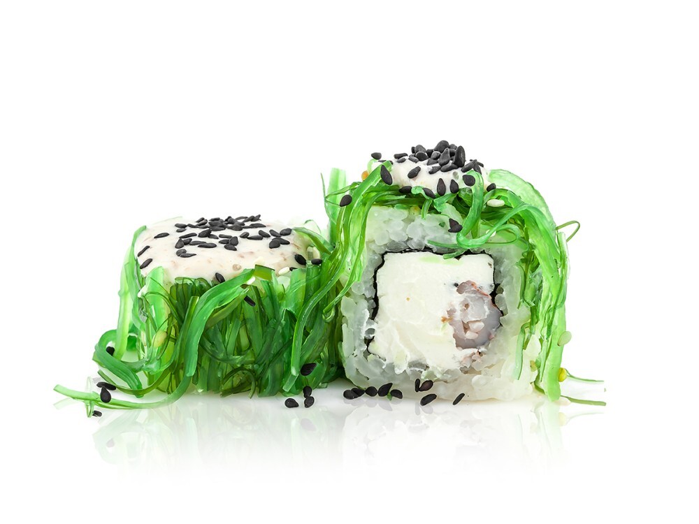 Креветка королевская, салат «Чука», сыр Филадельфия, кунжут, соус «Кунжутный», рис, нори (8 шт)