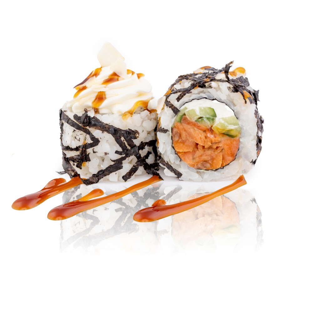 Лосось терияки, огурец, сыр Cremette, Миндаль, соус Терияки, рис, нори (8шт)