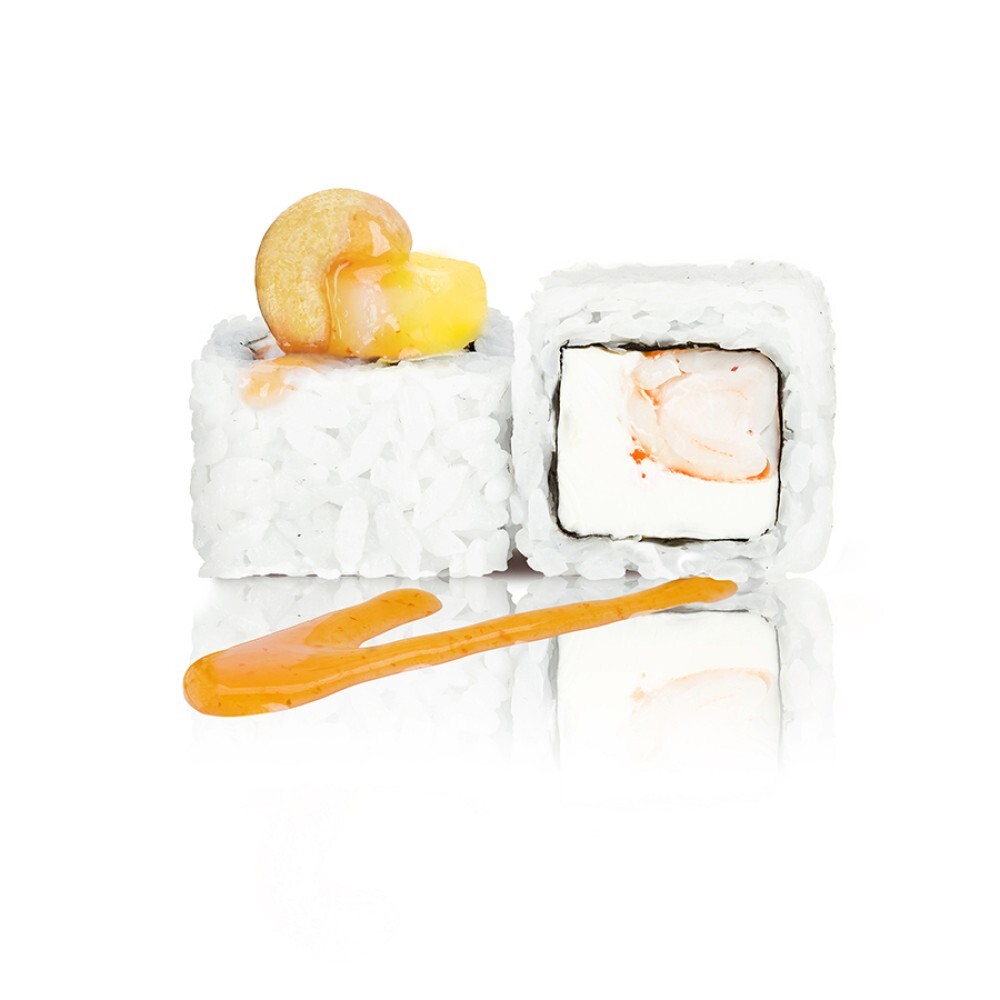 Королевская креветка, ананас, соус манго-чили, рис, нори