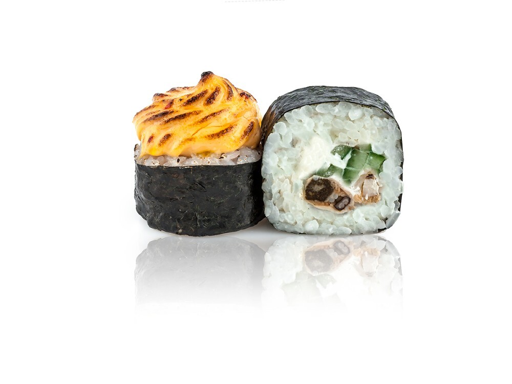 Мидии, огурец, сыр «Филадельфия», фирменная сырная шапка, соус «Унаги», кунжут, рис, нори (8 шт)