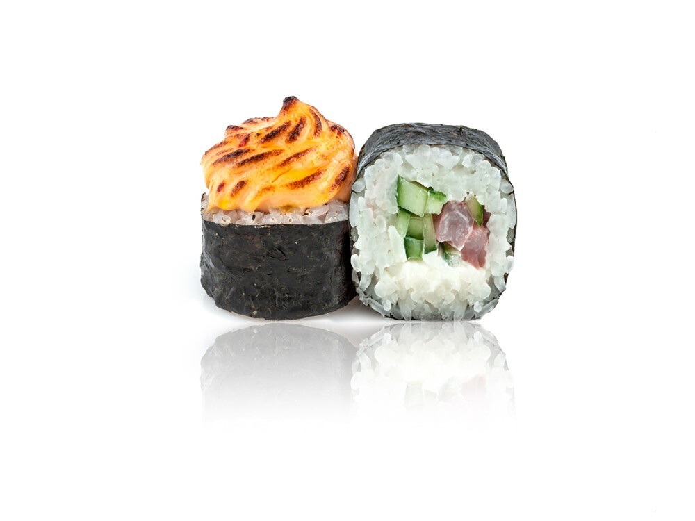 Креветка, огурец, сыр «Филадельфия», фирменная сырная шапка, соус «Унаги», кунжут, рис, нори (8 шт)