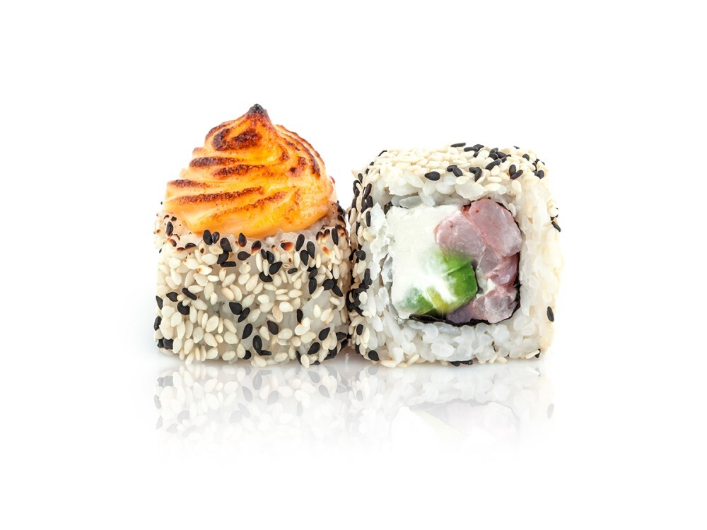 Креветка, авокадо, сыр «Филадельфия», фирменная сырная шапка, соус «Унаги», кунжут, рис, нори (8 шт)