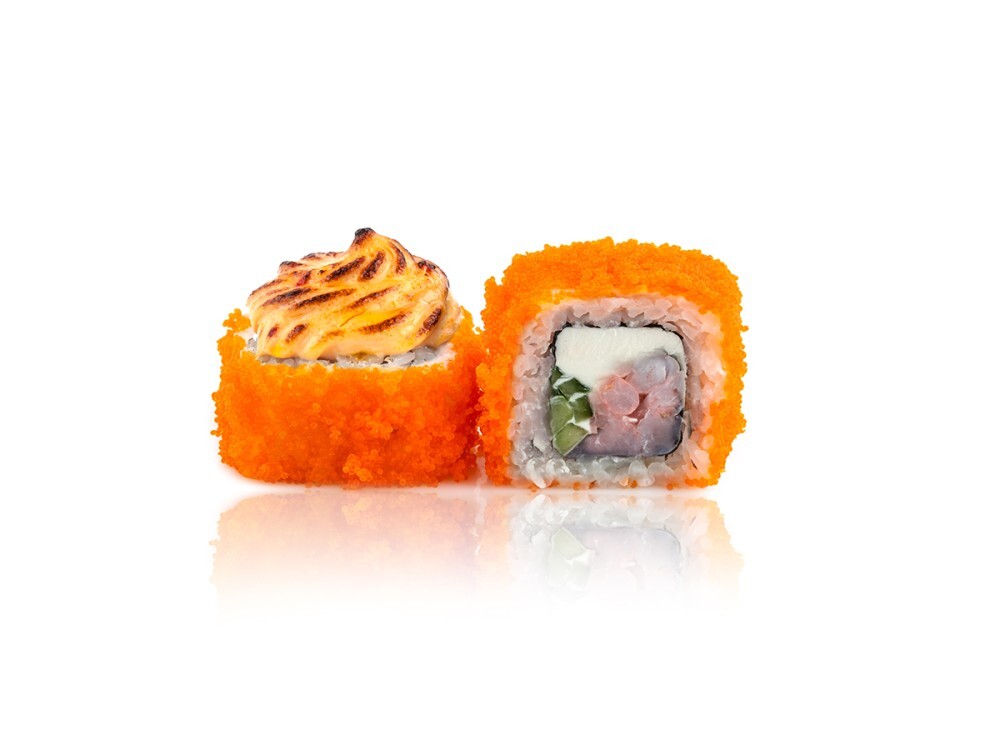 Креветка, огурец, сыр «Филадельфия», фирменная сырная шапка, икра масаго, соус «Унаги», кунжут, рис, нори (8шт))