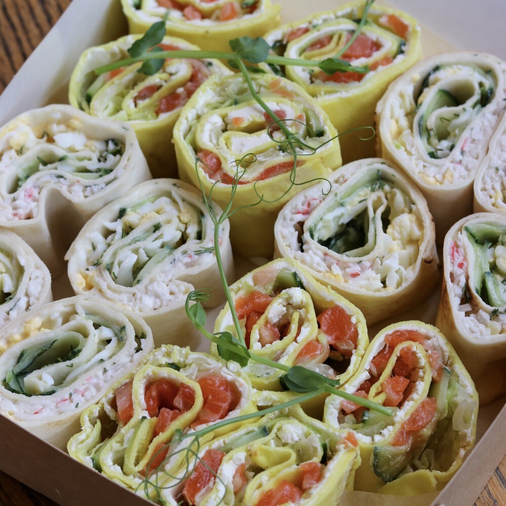 Рулет со снежным крабом и фирменным плавленным сыром с огурцом 8шт. Рулет с форелью ,творожным сыром, листьями салата и огурцом 8шт