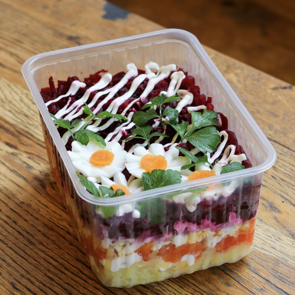 Фирменный салат с с/с форелью, яйцо, картофель, свекла, морковь ,заправляется майонезом